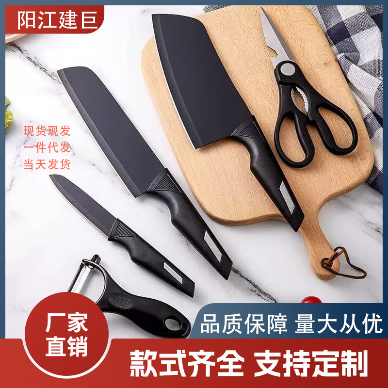 现货工厂直销黑刀组合厨房不锈钢刀具套装家用菜刀钢片柄厨师刀具
