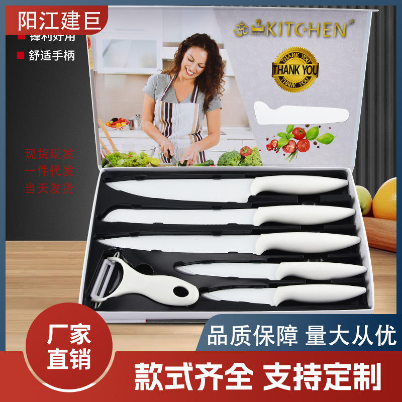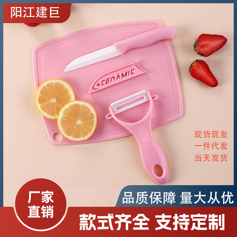 源头厂家陶瓷水果刀三件套双面吸彩卡包装带菜板瓜刨刀具套装