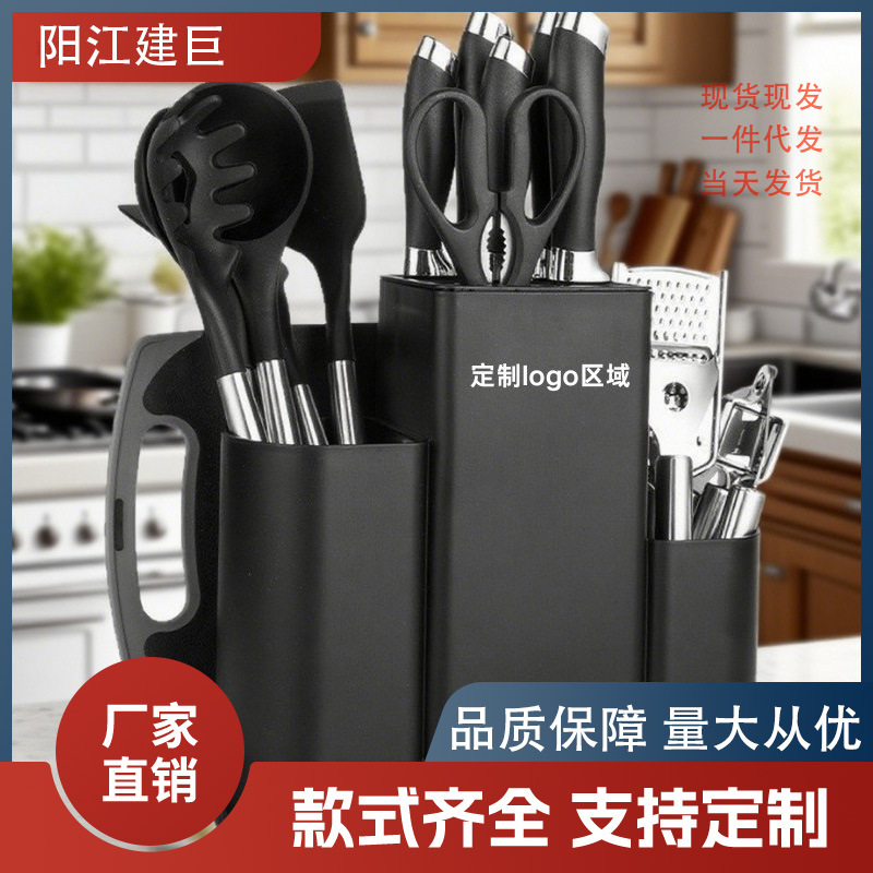 现货厂家直销20件套硅胶厨具汤勺锅铲菜板刀具套装收纳架厨具刀具