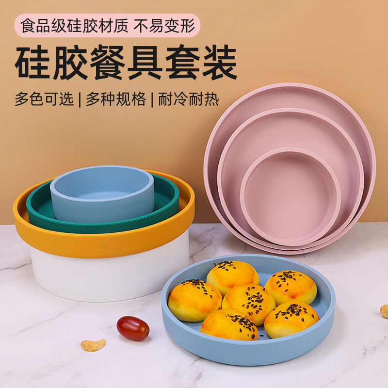 硅胶防摔碗碟餐盘硅胶餐具3件套家用圆形餐碟硅胶碗水果盘食物碟