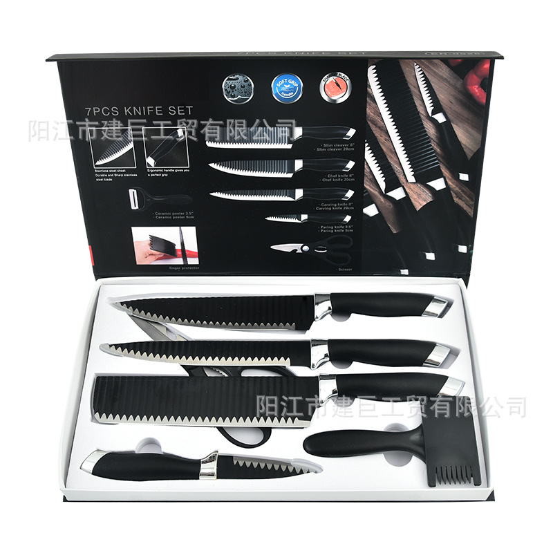 刀具套装阳江菜刀不锈钢喷漆双电镀头波浪纹七件套刀带护手器批发