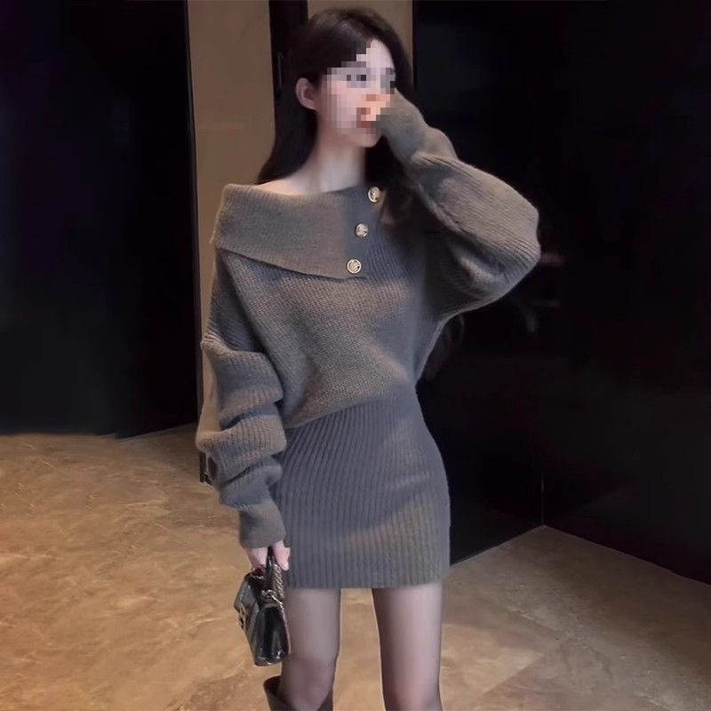 芯羊针织连衣裙子女秋冬季2025新款内搭法式包臀裙一字肩毛衣短裙