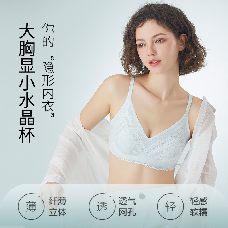 新款舒适透气无痕内衣上托收副乳大胸显小文胸蕾丝超薄水晶杯胸罩
