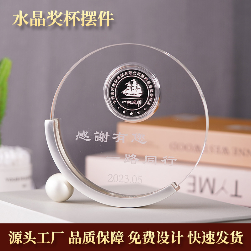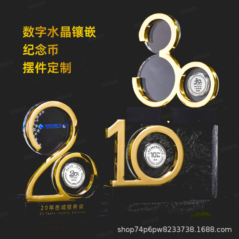 水晶镶嵌纪念章金币纯银纪念章优秀员工入职周年水晶表彰摆件批发