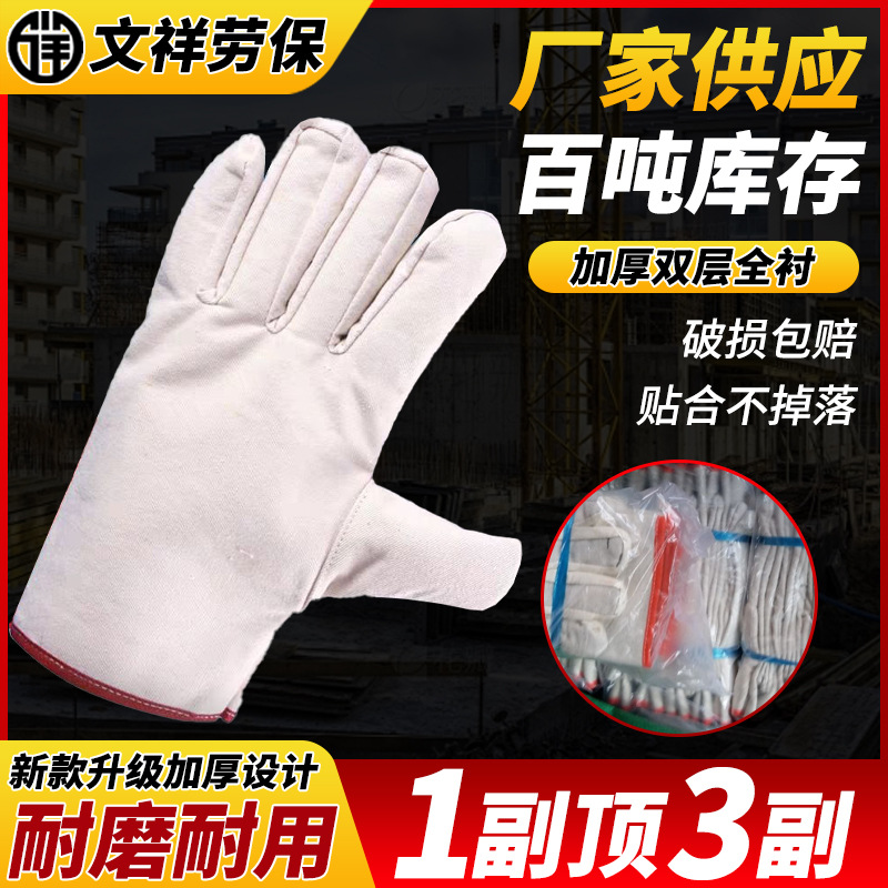 -               纯棉隔热双层全衬男女帆布手套工厂建筑工程耐磨电焊劳保批发舒适