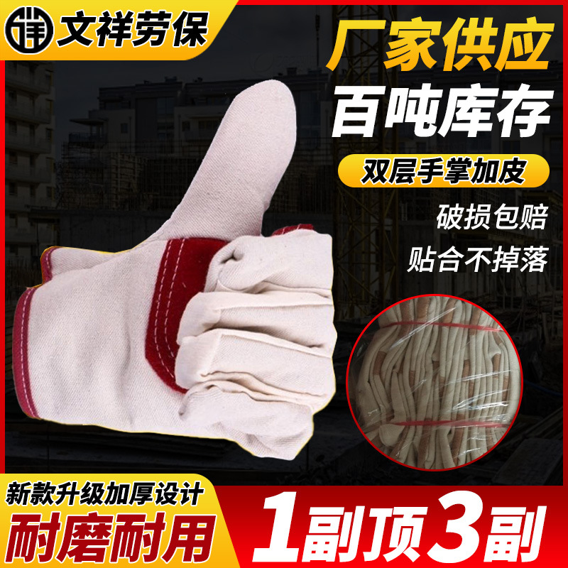 -               全棉手心加皮加固耐磨耐脏双层手套工厂机床电焊批发劳保用品防滑