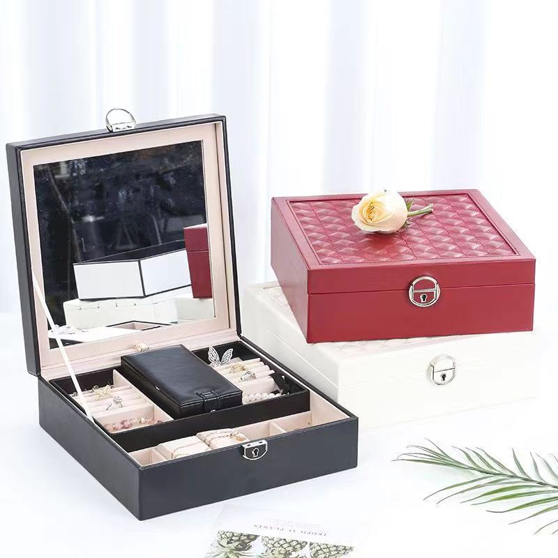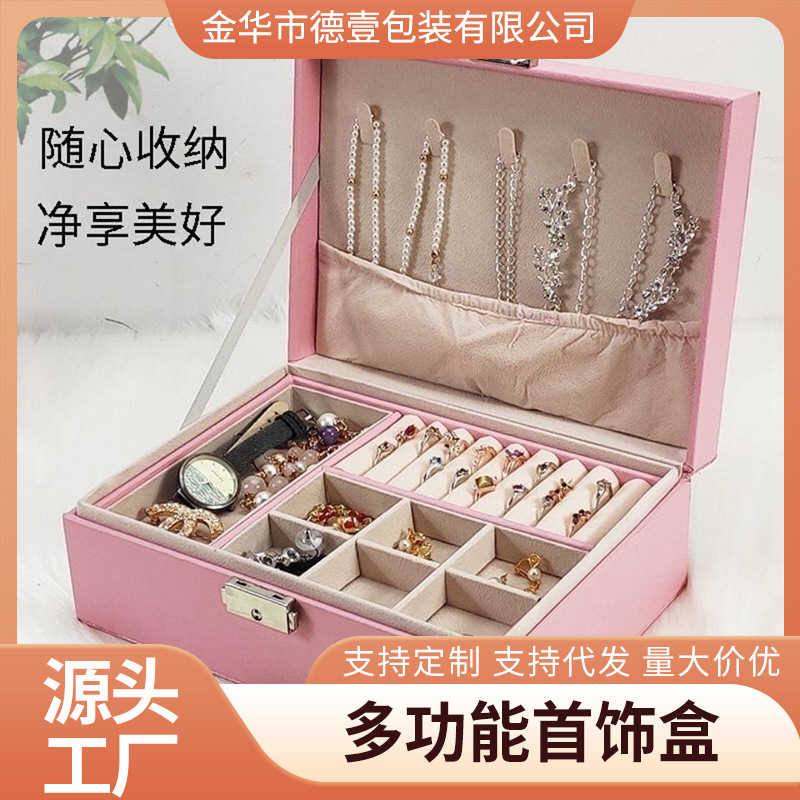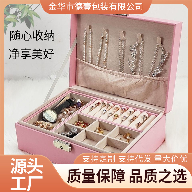 大容量双层首饰收纳盒带锁pu皮革耳环戒指饰品收纳盒子包装盒储物