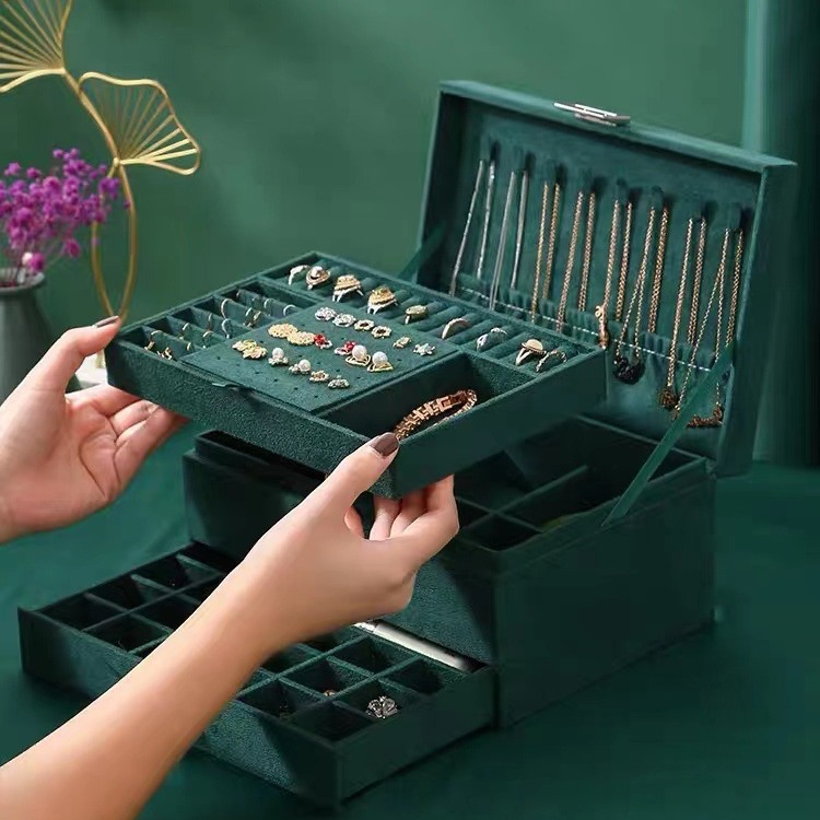 三层带锁首饰盒大容量绒布耳环项链手镯饰品收纳盒支持定制礼盒