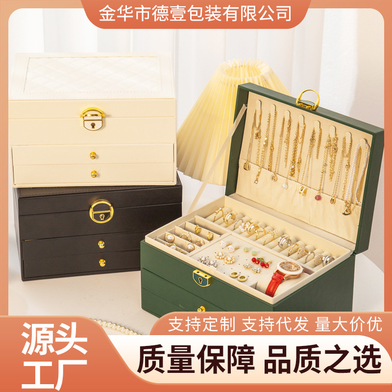 菱格纹首饰盒新款复古抽屉带锁高级珠宝项链戒指耳饰品首饰收纳盒