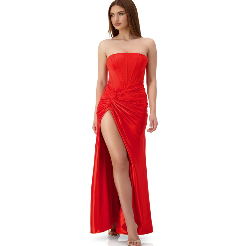 新品跨境欧美风度假宴会连衣裙气质性感修身抹胸鱼骨开叉晚礼服裙