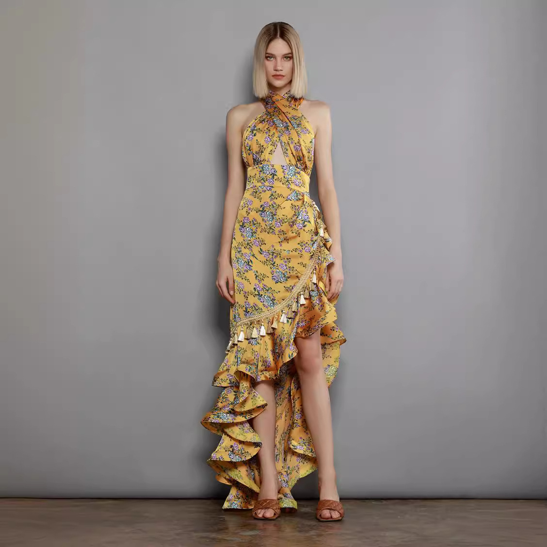 跨境宴会礼服夏季印花挂脖露背碎花裙女下摆不规则荷叶边长款连衣