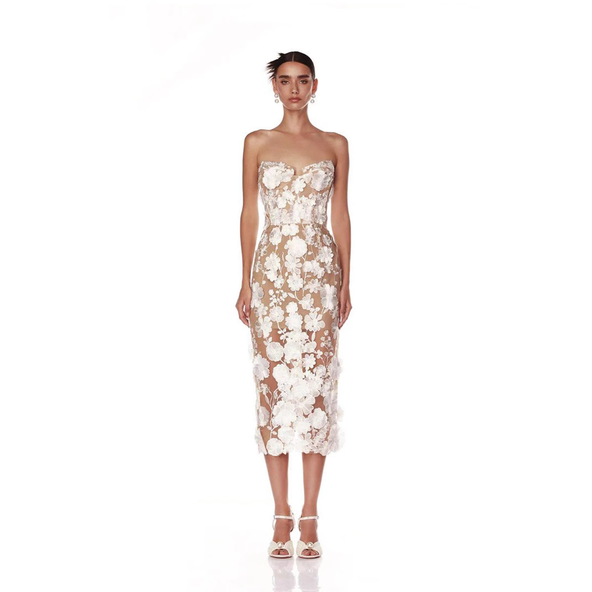 跨境女装奢华名媛礼服性感抹胸露背刺绣立体花朵包臀修身连衣裙女