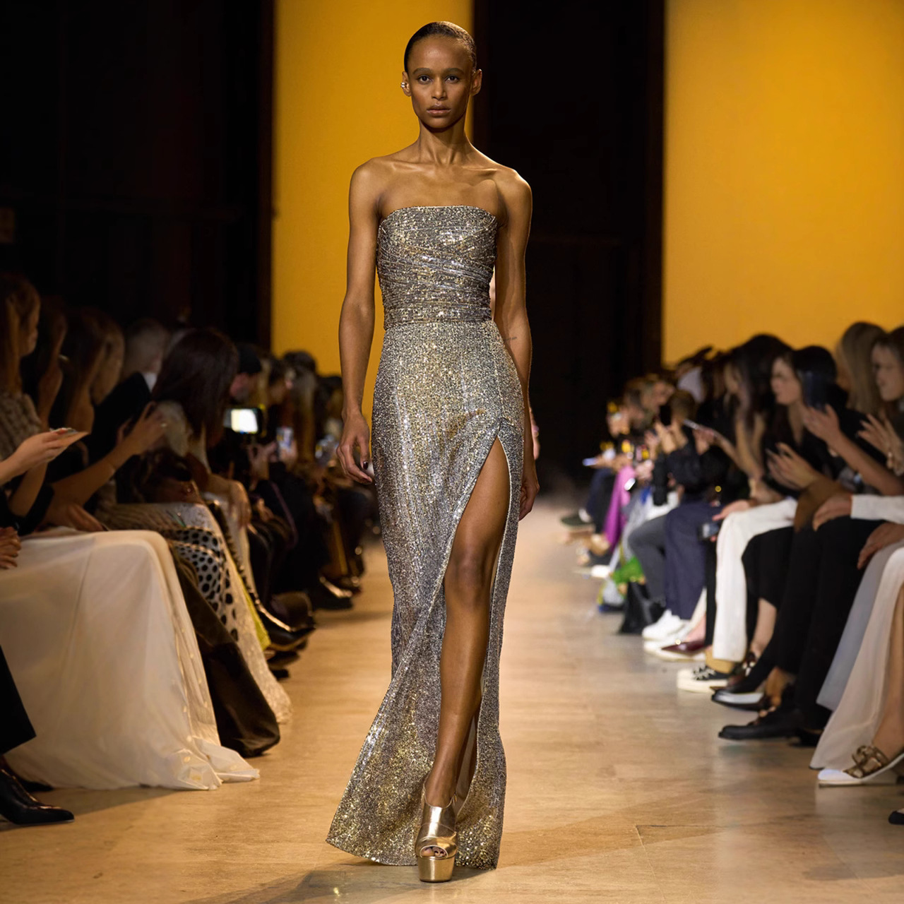 时尚高端欧美性感抹胸露背连衣裙长款修身抽皱下摆开叉宴会晚礼服