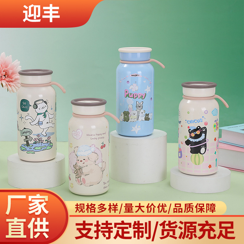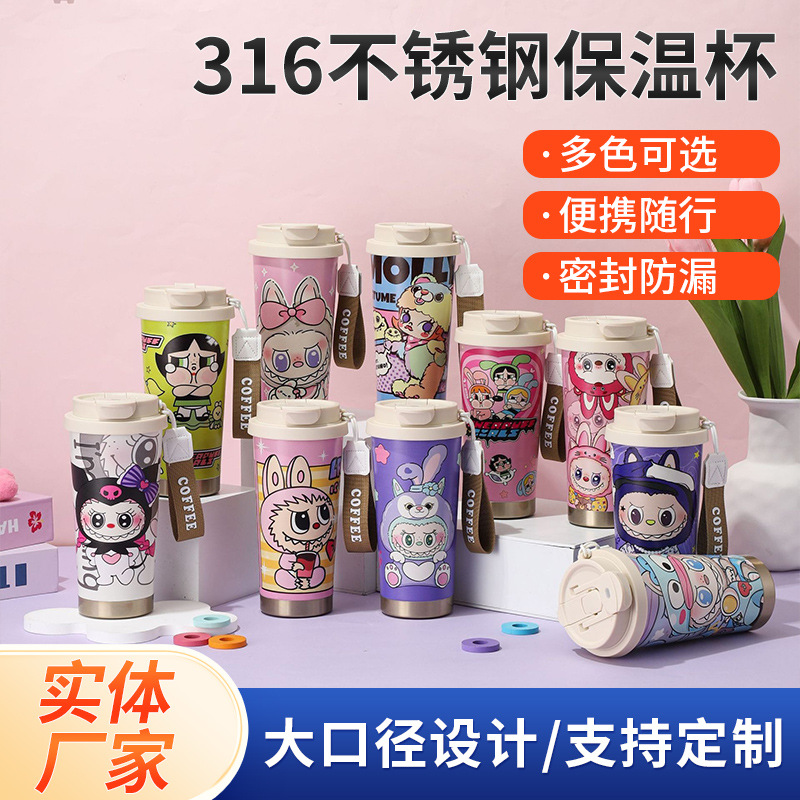 316不锈钢保温杯可爱卡通图案便携铃兰杯高颜值时尚带提绳咖啡杯