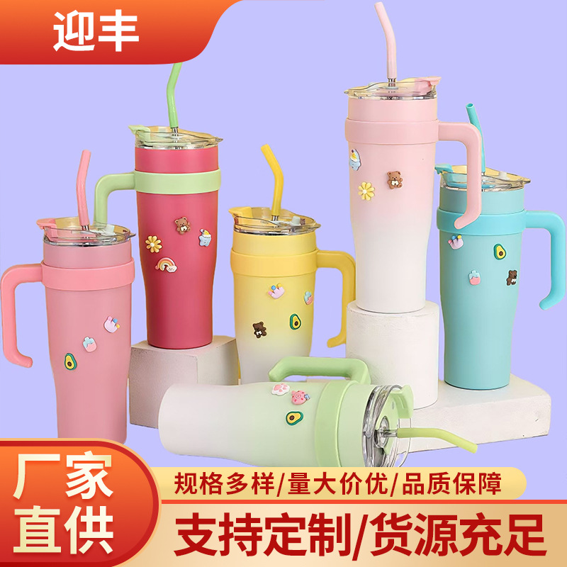 新款跨境304不锈钢保温杯卡通吸管杯带手柄大容量保温杯高颜值
