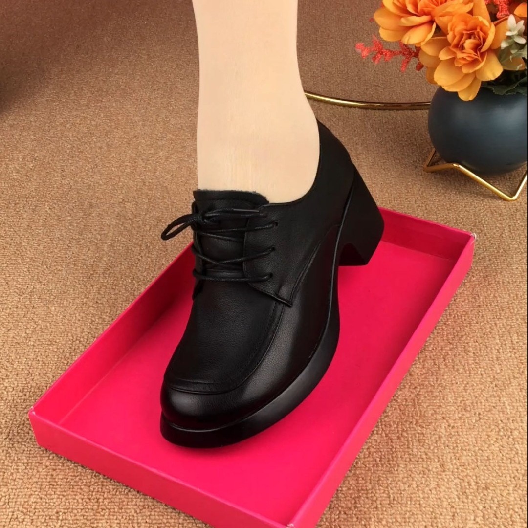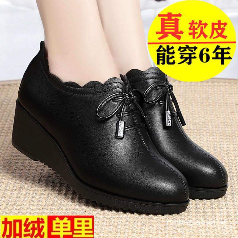 跨境现货批发妈妈鞋百搭软底单鞋坡跟春秋季系带中年女士深口皮鞋