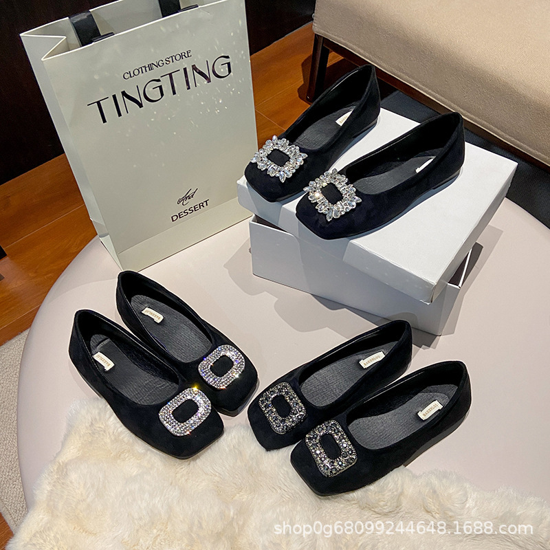 跨境新中式方头单鞋浅口低跟2025百搭新款水钻气质黑色软底女鞋工