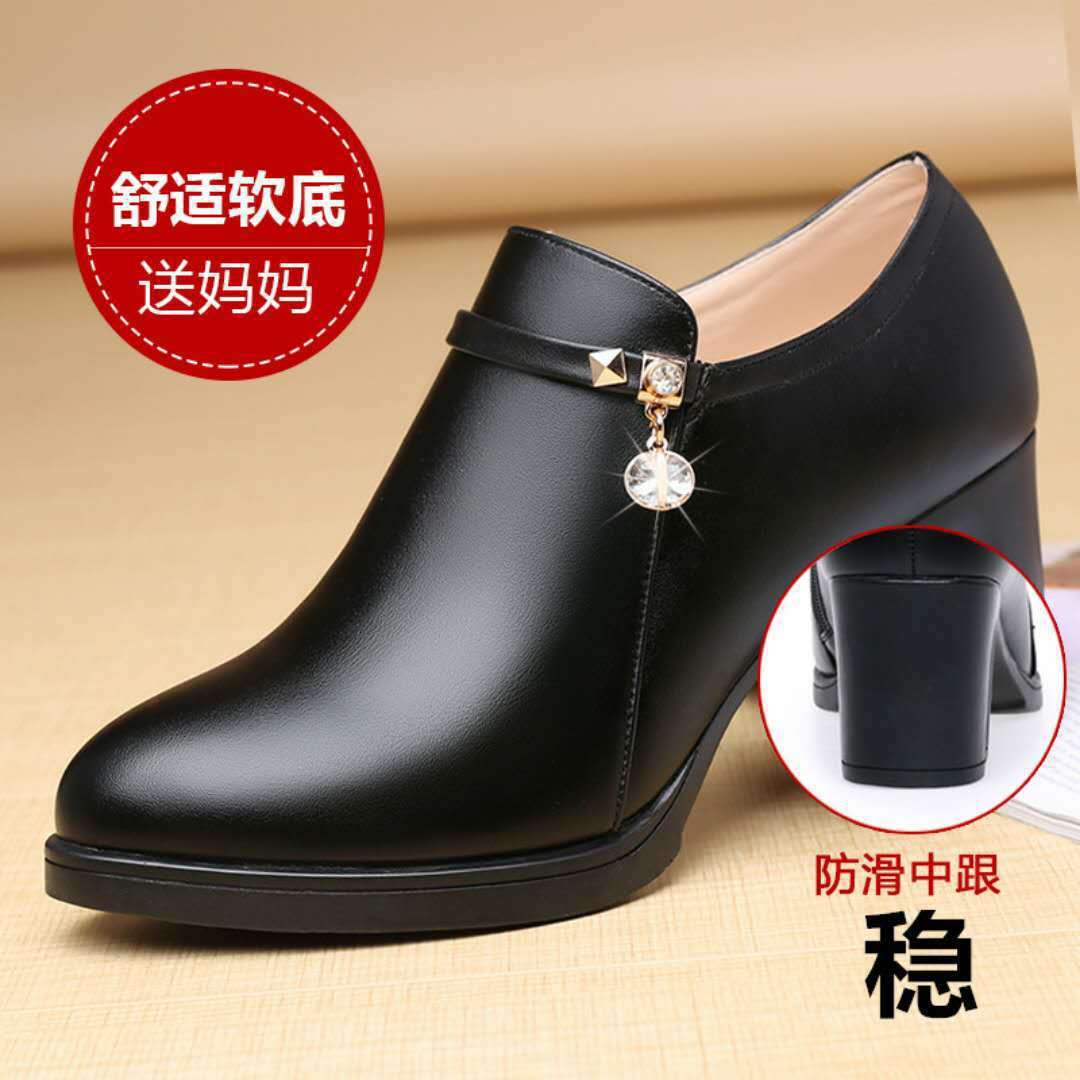 跨境妈妈鞋春秋款真软皮舒适粗跟浅口四季中年工作鞋中跟洋气女士