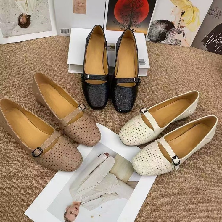 跨境软皮单鞋女2025新款夏季镂空网纱女鞋圆头粗跟豆豆鞋透气乐福