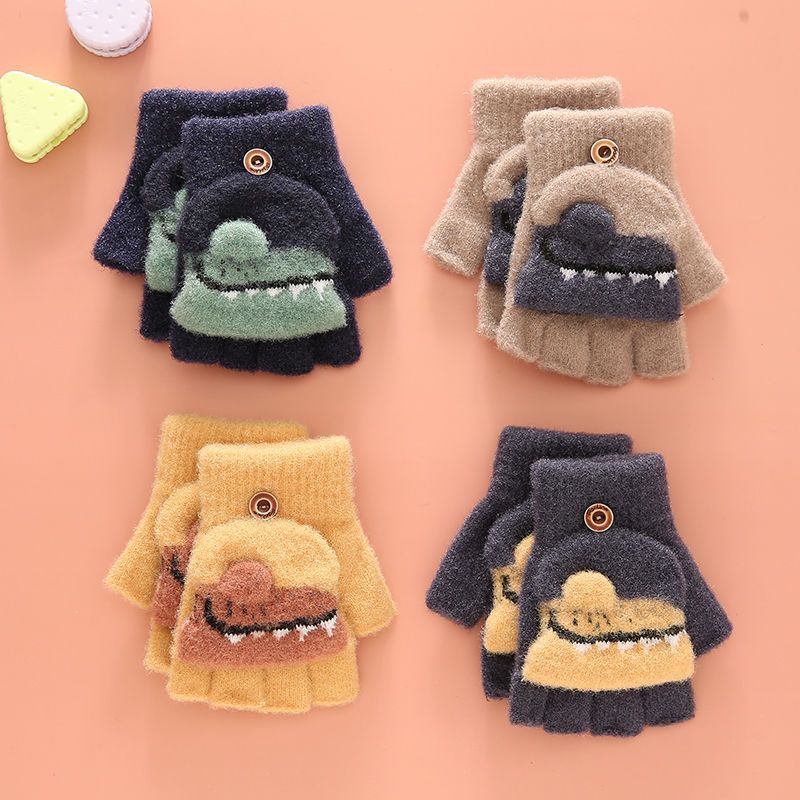 新款儿童手套男女秋冬季保暖加绒半指翻盖卡通小孩水貂绒学生写字