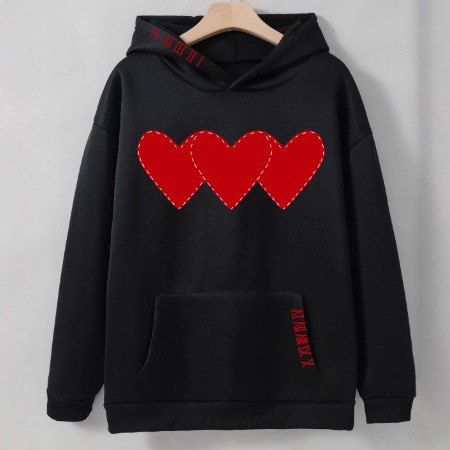 2025外贸女式加绒卫衣 素色心形印花 袋鼠口袋抽绳印花连帽衫批发