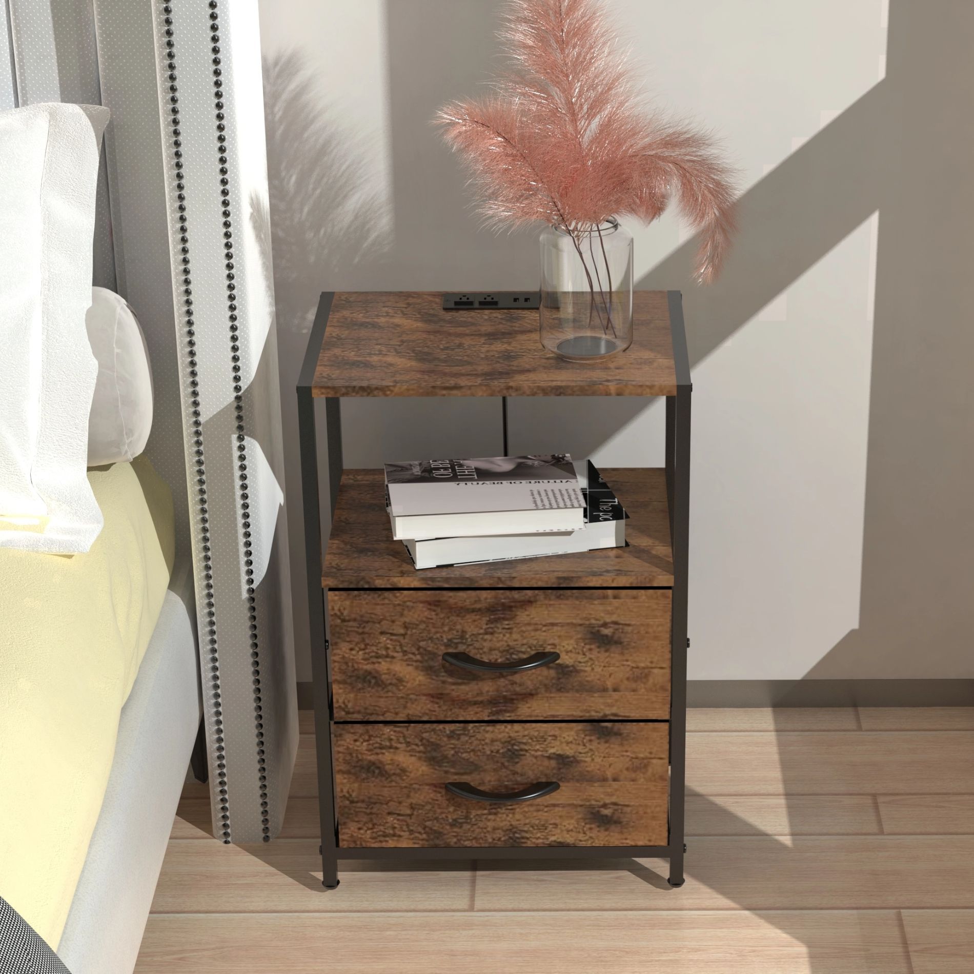 带抽屉床头柜边几茶几边桌带充电站的USB端口和插座3层收纳置物架
