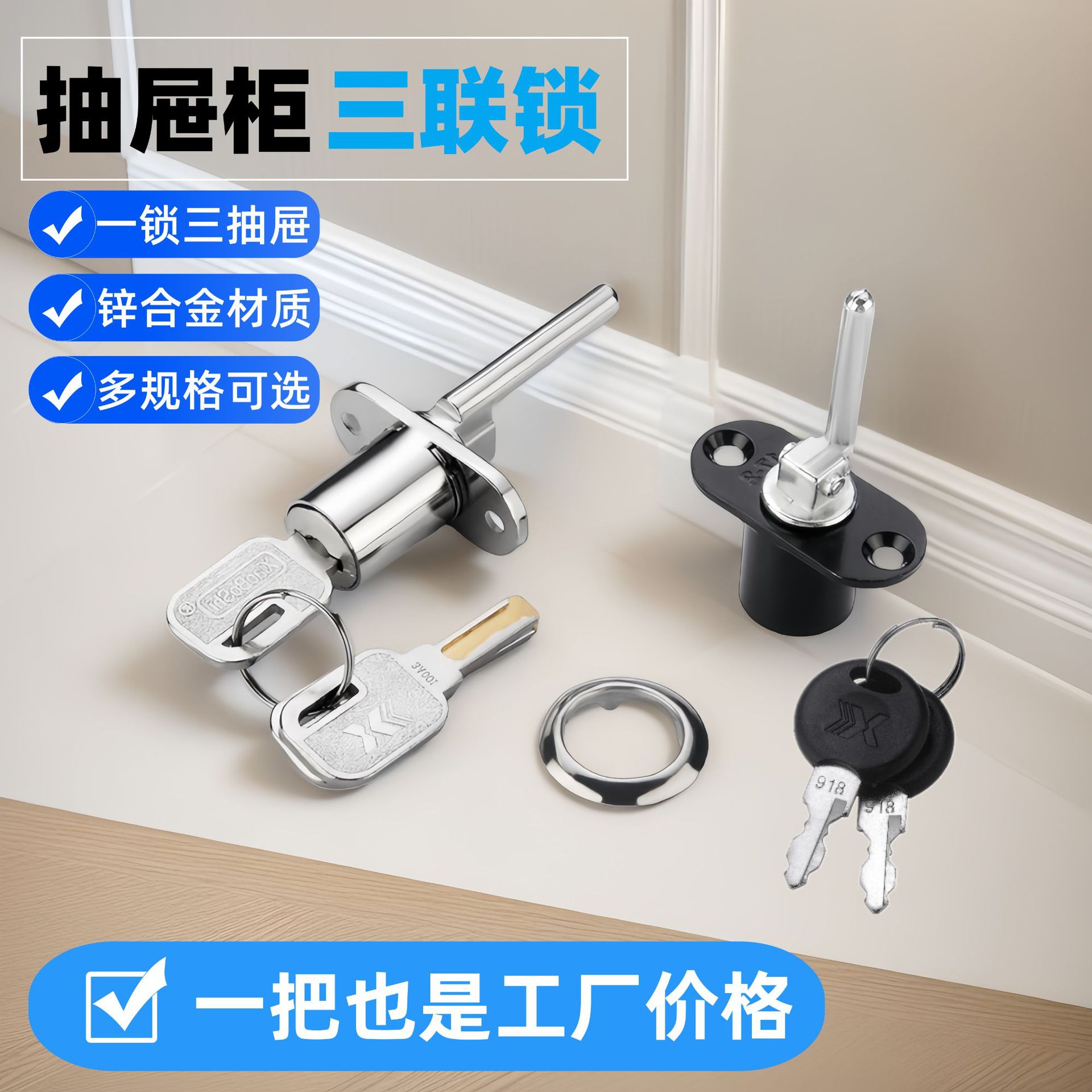 小博士抽屉锁一锁三矮柜三连锁储物档案文件柜联动锁芯抽屉三联锁