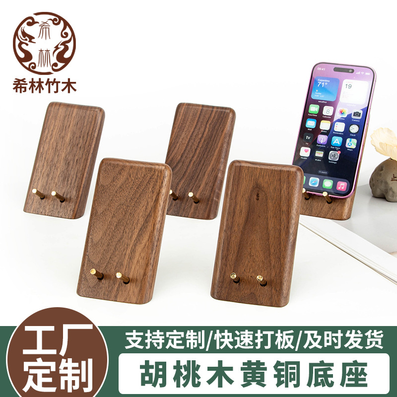 高档实木黑胡桃黄铜手机支架桌面简约便携手机底座可刻字LOGO