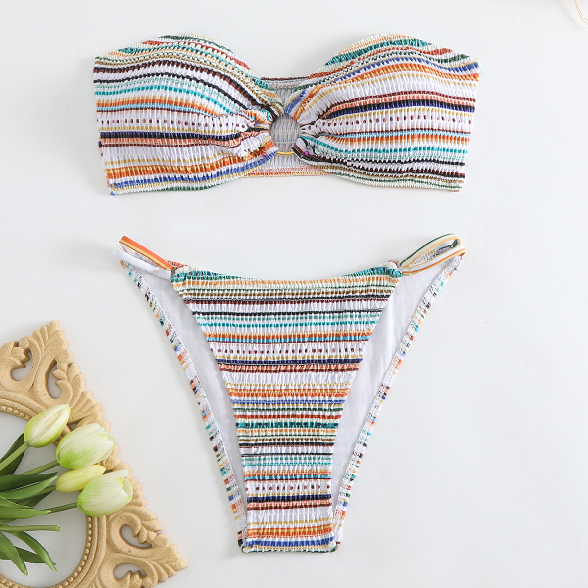 抹胸条纹分体比基尼 2025新款欧美跨境泳装 ins风特殊面料泳衣女