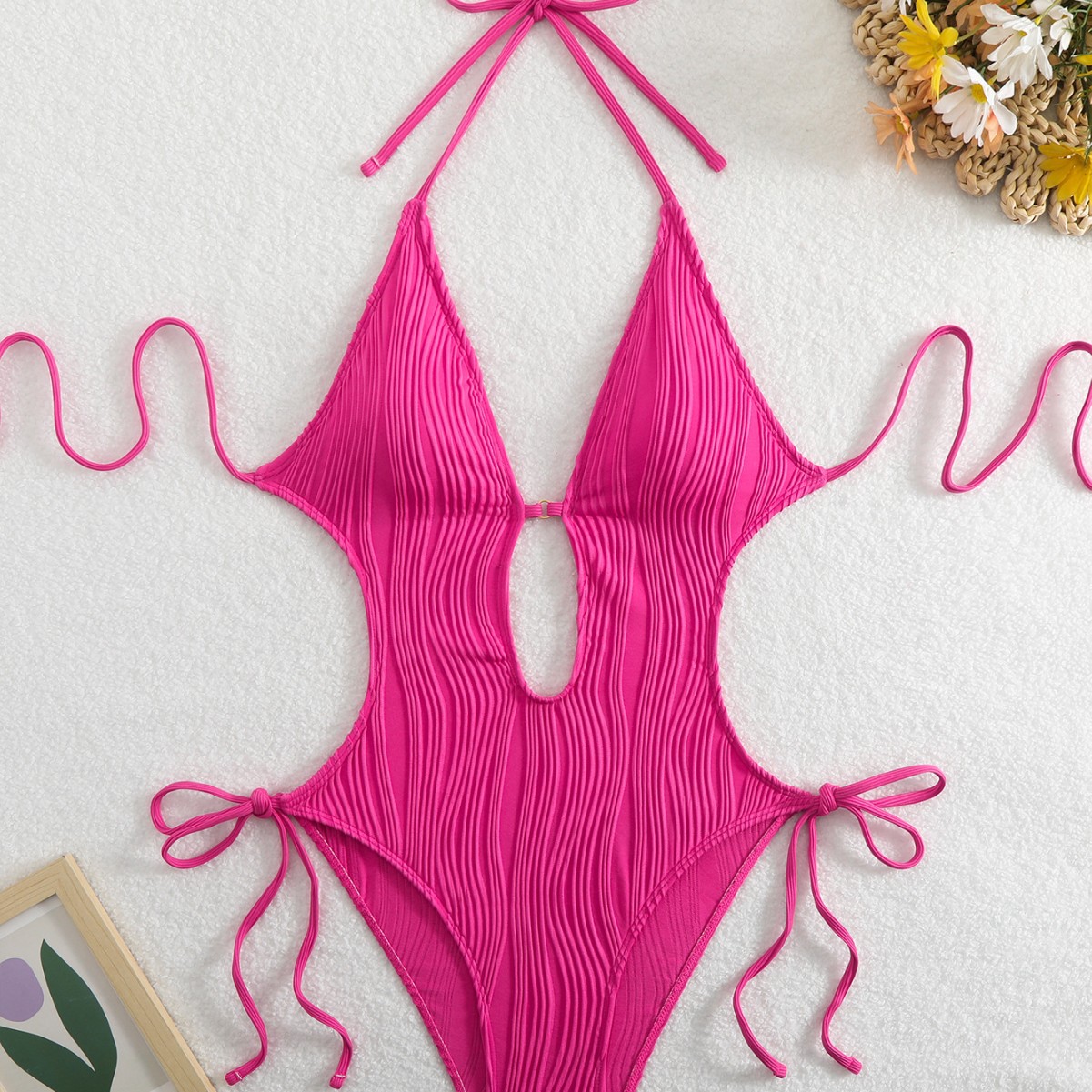 欧美外贸时尚爆款泳衣一件式镂空绑带露背泳装热卖纯色比基尼现货