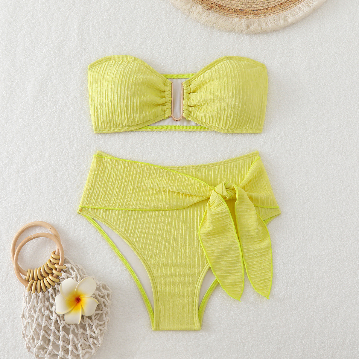2025年新款抹胸纯色简约黄色比基尼高腰蝴蝶结欧美外贸跨境泳衣女