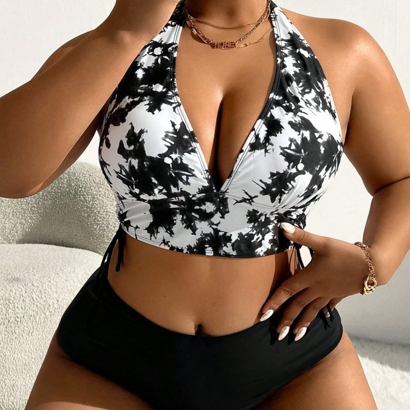 欧美分体印花时尚比基尼抽绳挂脖绑带露背性感泳装大码肥婆泳衣女