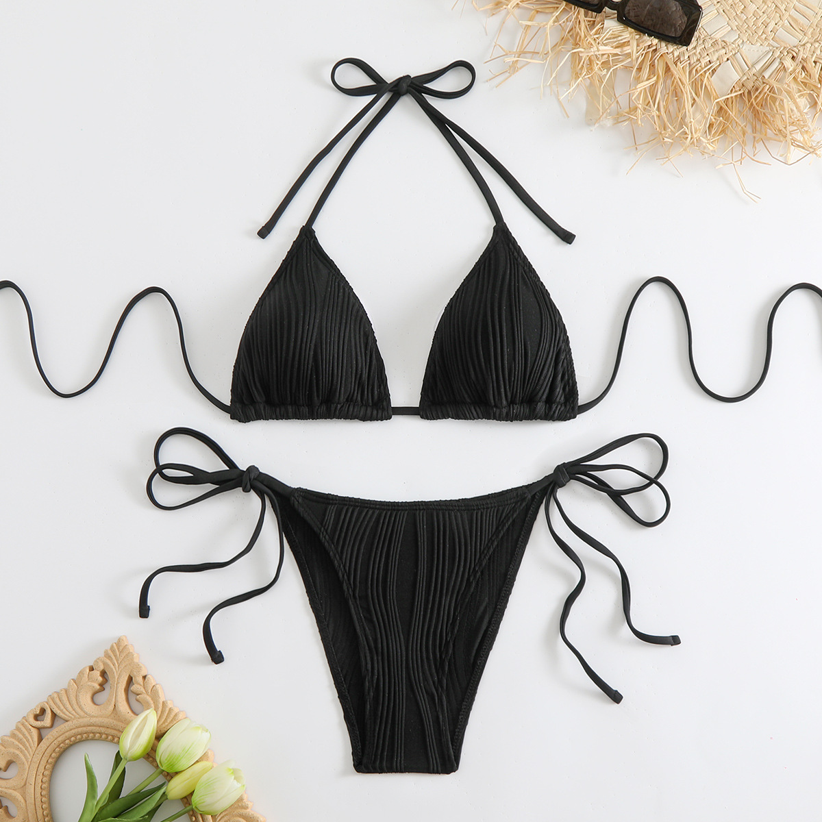 ins风欧美跨境外贸比基尼绑带挂脖性感露背泳衣 黑色特殊面料泳装