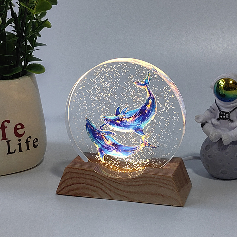 -               跨境3d激光内雕发光水晶球小夜灯四叶草海豚创意桌面摆件生日礼物