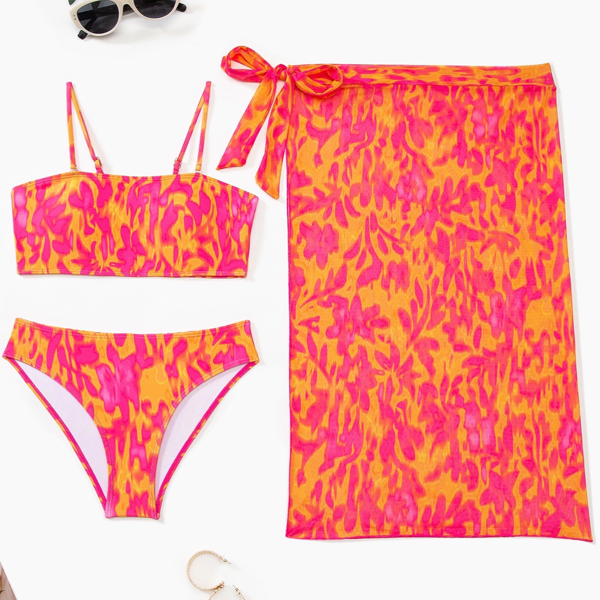 欧美印花分体三件套比基尼女纱裙度假外贸定制沙滩泳装纯欲风泳衣