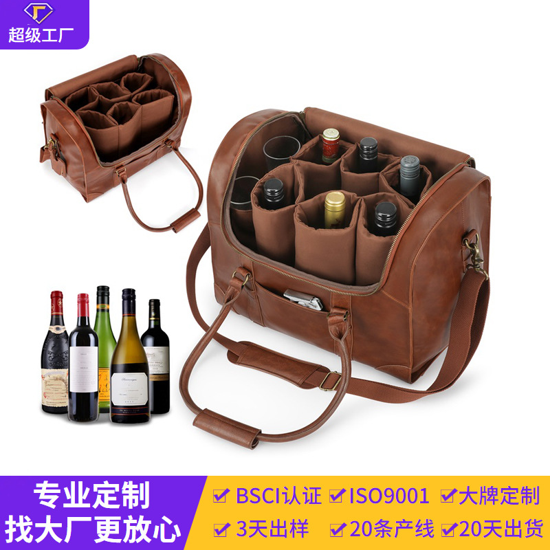 定制户外红酒袋疯马纹PU大容量6瓶装可拆卸内胆高档皮质酒水酒袋