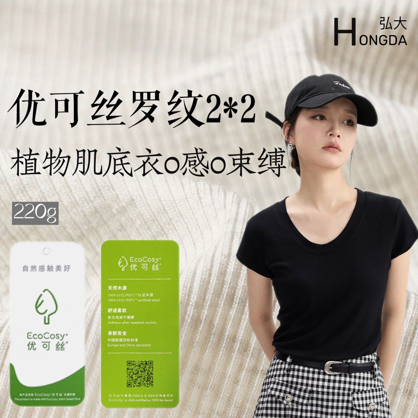 220G优可丝人棉罗纹2x2针织布7A抗菌面料童装背心吊带T恤布料