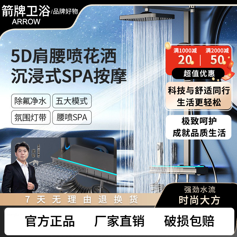 箭᷂牌方管腰喷氛围灯大置物蓝牙音乐数显钢琴按键浴室增压淋浴花