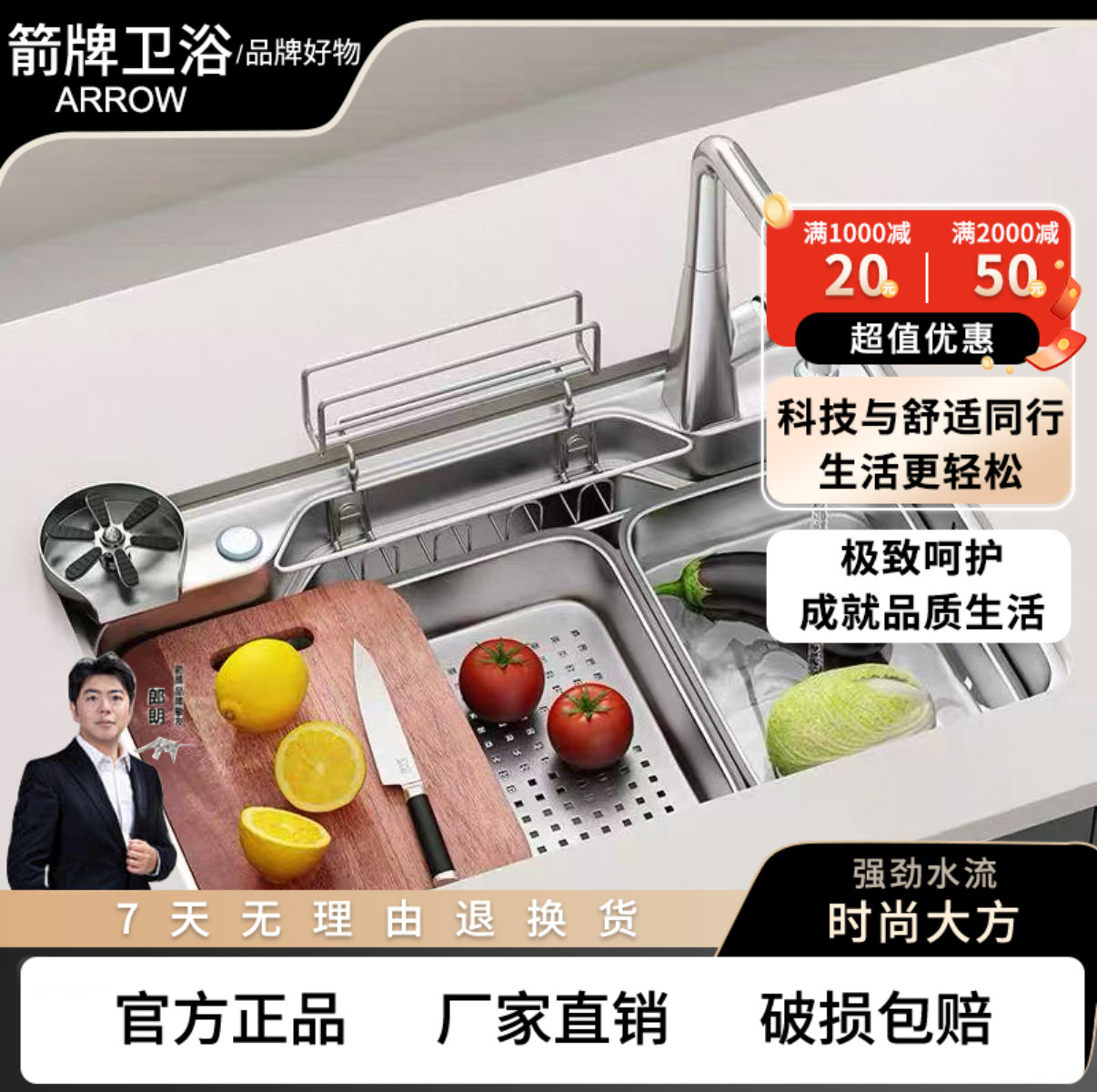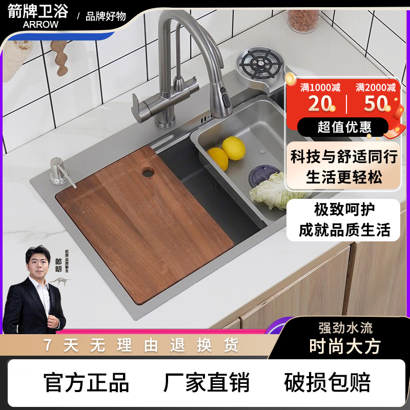 箭᷂牌厨房水槽大单槽洗菜盆家用洗碗洗菜手池一体台中上下盆304