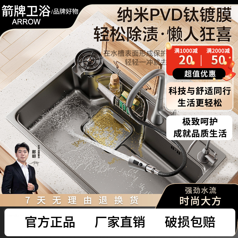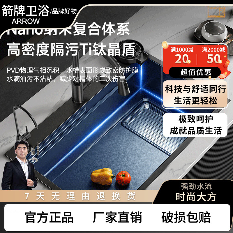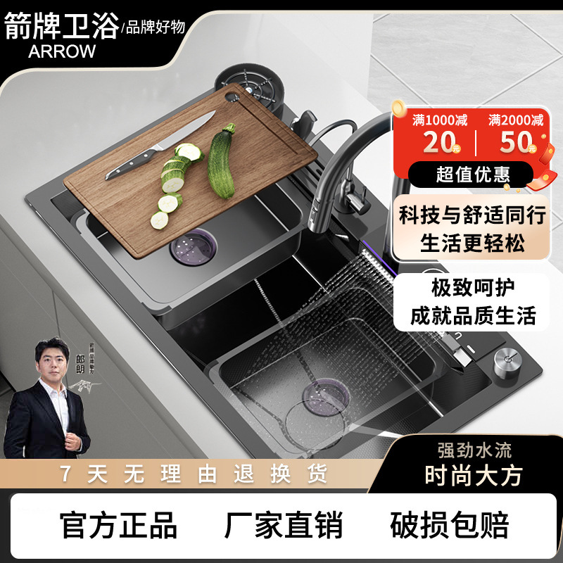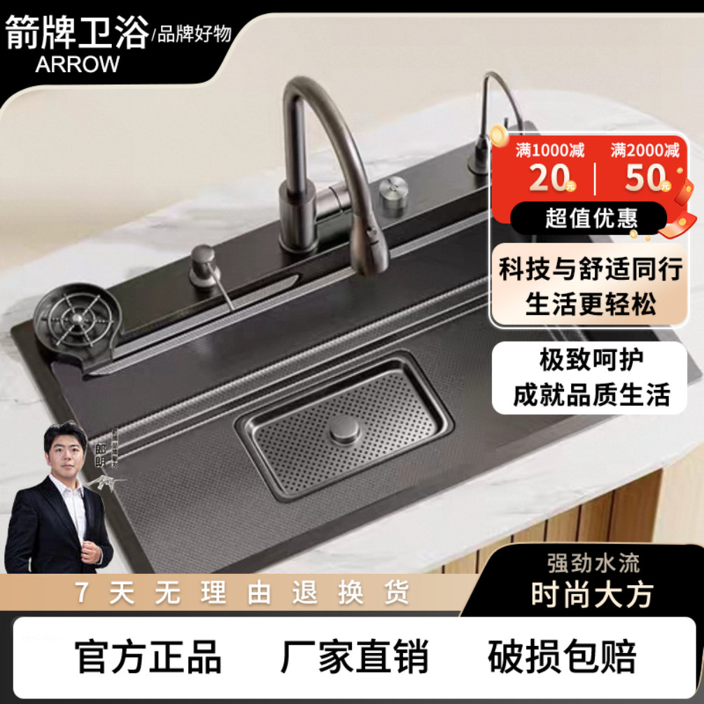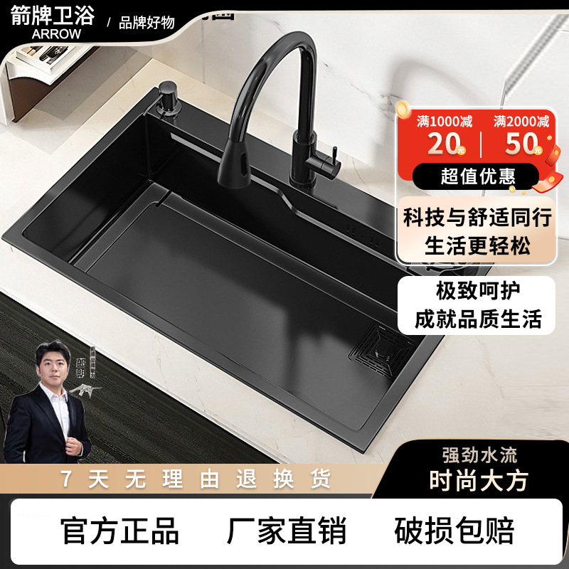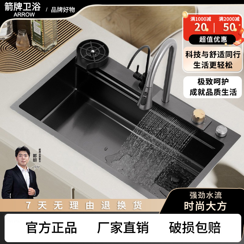 箭᷂牌304不锈钢纳米黑色水槽厨房洗菜飞雨瀑布出水家用厨房大单