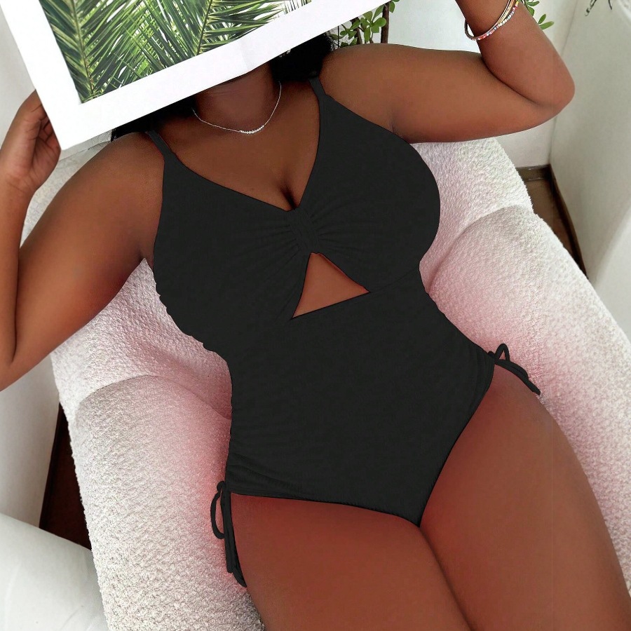 2025新款大码连体泳衣女款欧美亚马逊镂空比基尼坑条面料泳装