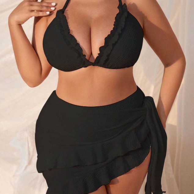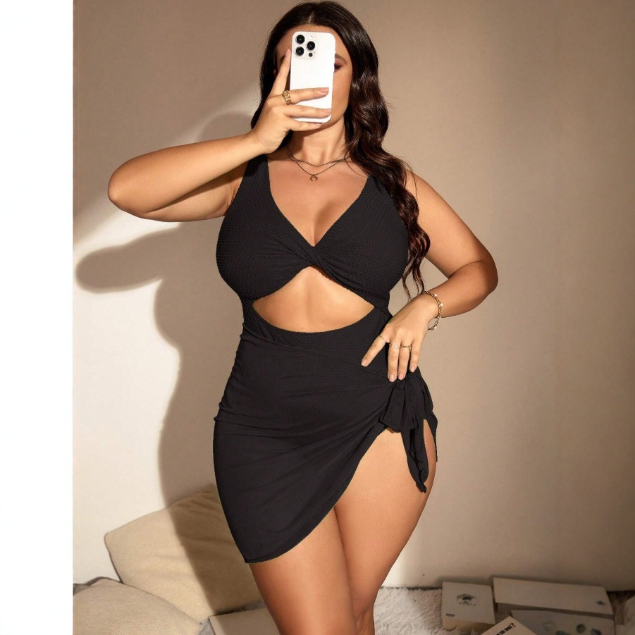 2025新款大码欧美跨境时尚女装V领镂空褶皱包三件套性感露背