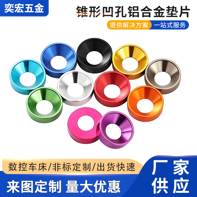 五金彩色铝合金垫片凹孔鱼眼锥形沉头螺丝垫片数控车床加工厂家