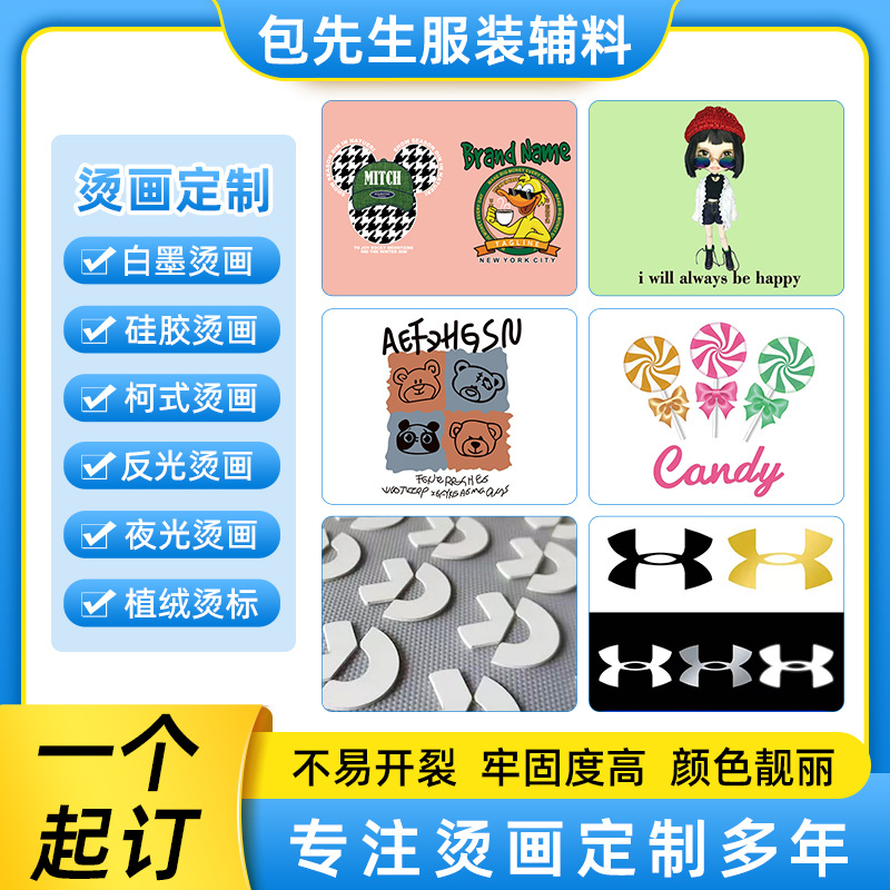 烫画制作服装logo印花柯式白墨烫金烫银水洗标唛批发