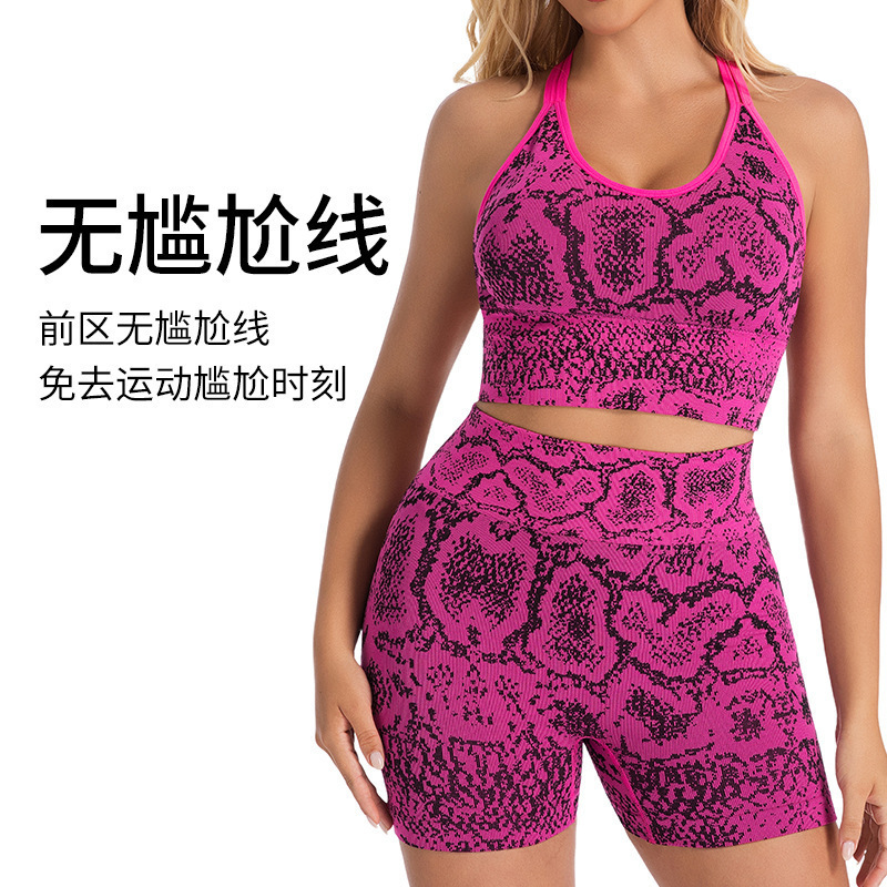 跨境欧美亚马逊瑜伽运动跑步套装性感蛇纹双肩带美背瑜伽服两件套