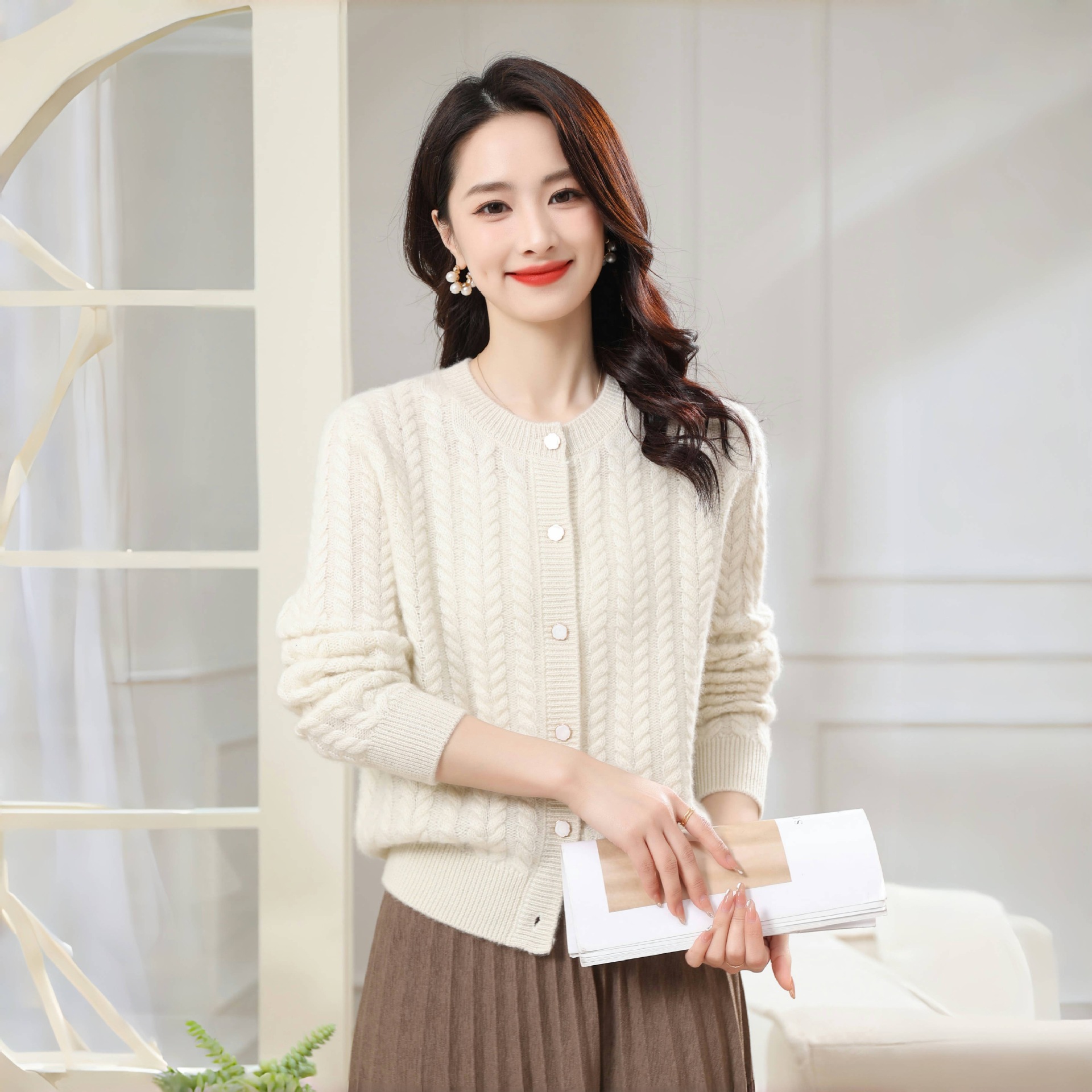 25秋冬100%纯羊绒开衫女圆领扭花长袖针织毛衣羊毛衫外套纯山羊绒