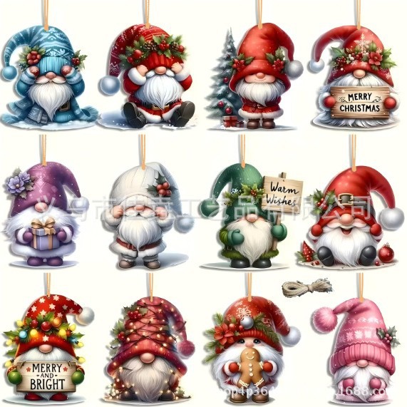 跨境12件圣诞木制挂饰圣诞快乐复古侏儒圆形圣诞装饰品圣诞派对家