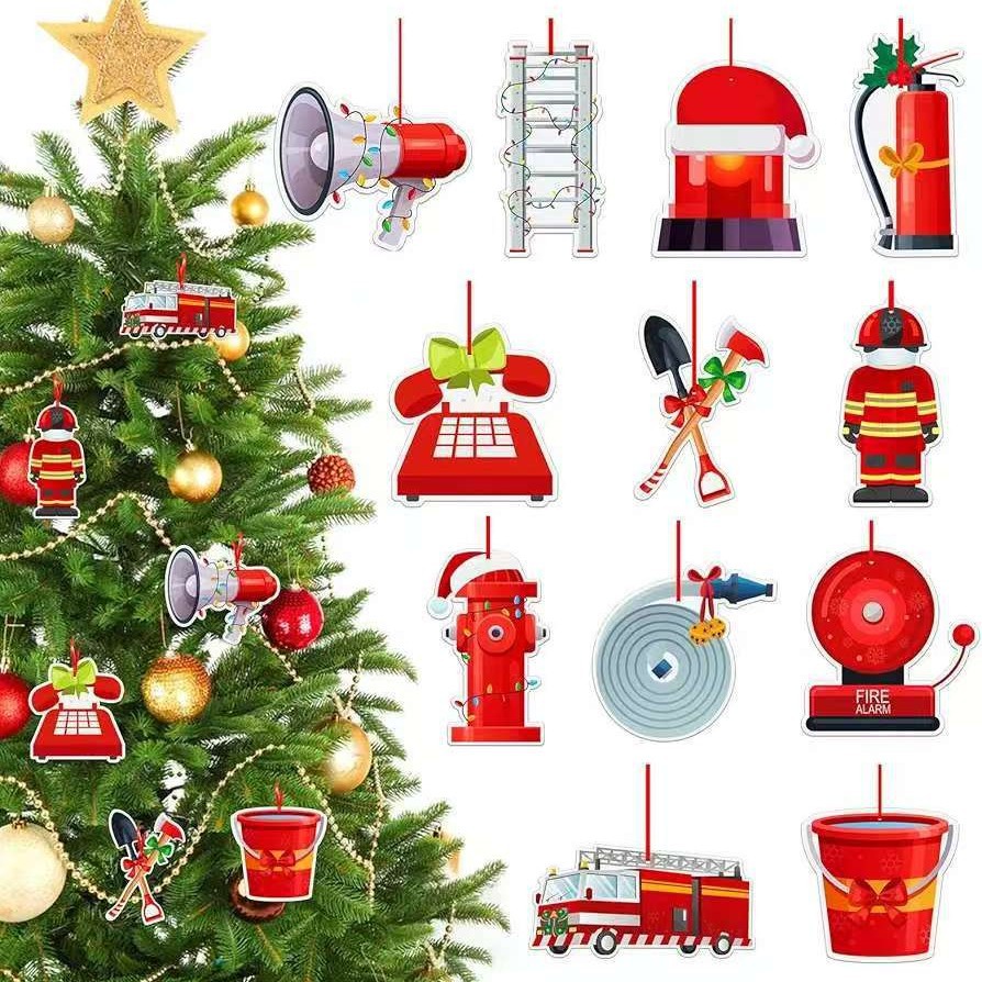 圣诞消防员饰品消防员头盔制服消防车消防栓灭火器木制圣诞树装饰