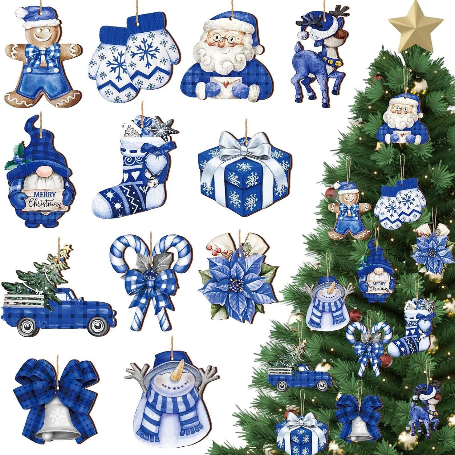 新品12件蓝色雪木质装饰挂件圣诞树装饰品节日家居窗户装饰理想家