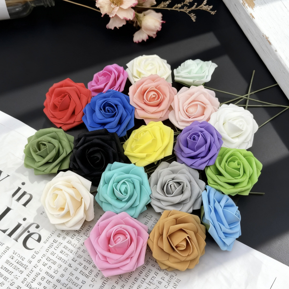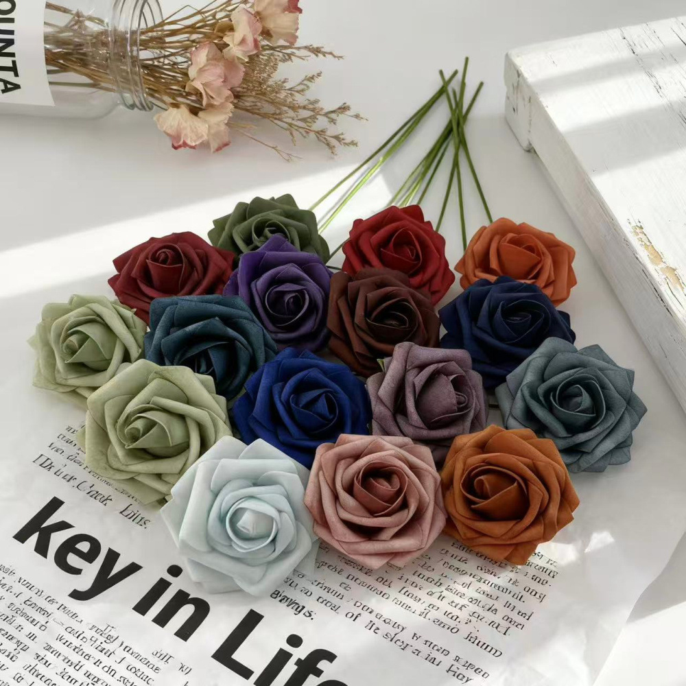 亚马逊花束染色礼盒pe泡沫玫瑰花8cm托带杆仿真花家居装饰插花